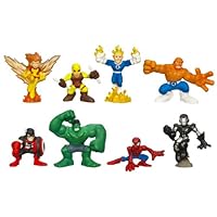 Similar to the Galactic Heroes, these 2â? figures should have limited articulation. These child-friendly characters are more benign superheroes and supervillains, ready to talk things out or, hey, solve things with a nice game of Chutes and Ladders. This is a pretty impressive set---featuring eight characters and a storage box.The Dark Phoenix is clad in her typically dark colors. Sheâ?TMs joined with a flame-winged phoenix manifestation. The Dark Phoenix is plagued by a corrupt influence and given to occasional acts of cataclysm.The Daredevil is depicted in a yellow and dark brown costume, and is armed with his divided Billy Club. Having traded conventional eyesight for mutagenically-augmented senses, the Daredevil is one of the more formidable Marvel heroes.The Human Torch is depicted in mid-flame mode---fringed by tongues of yellow flame with his blue and white Fantastic Four costume revealed. The result of cosmic ray bombardment, the Human Torch is imbued with the ability to personify and control fire.The Thing looks like he wants to give someone a big hug. Clad in his Fantastic Four-themed blue tights and white boots, the Thing is steeped in superhuman strength and sheathed in a bright-orange, rock-textured hide.Captain America is clad in the dark US Agent-style costume and is armed with his Nazi-splattering shield. A result of the Super Soldier serum, Captain America is a master strategist and an experienced physical combatant.The Hulk is green and clad in tattered blue pants. The largest figure in the assortment, surpassing even the bulk of the Thing, the gamma-spawned Hulk is ready to pulverize everyone with a hundred milesâ?TM radius---especially Thunderbolt Ross.War Machine, clad in black and silver armor, is depicted hovering above a cloud of rocket exhaust. Having sometimes served as a surrogate Iron Man, the War Machine is clad in a more powerful version of the standard Iron Man armor.