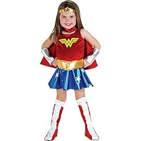 The strength of Hercules, the wisdom of Athena, the beauty of Aphrodite, and the speed of Hermes--Wonder Woman has it all! Your little superhero will love fighting injustice in our Toddler Wonder Woman Costume. This classic red, white and blue costume is spangled with stars and includes the famous tiara, dress, and cape. The costume also comes with authentic extras, like "bullet-proof" bracelets, the "golden girdle," and boot tops. One size fits toddlers who wear sizes 1-2T, with a dress 16" tall from shoulder to hem and 18" around the torso.