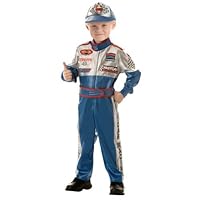 Includes jumpsuit with racing logo and attached belt and cap. Shoes not included.