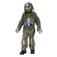 This Child's Skeleton Zombie Costume is sure to scare the living daylights out of any crowd! This frightening look comes with pants and a shirt that provide maximum mobility and easy wear, whether children are trick-or-treating or wandering graveyards in pursuit of revenge!All nightmarish details have been included, with a stunningly scary mask, a pair of zombie gloves, and bone and gauze accents for the undead look.