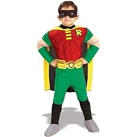 Show off your muscles with this deluxe Teen Titans Robin costume. Costume includes:black eye mask, chiseled padded muscle chest jumpsuit with attached boot tops, yellow cape, and yellow belt.This is an officially licensed Teen Titans andDC Comics product. Costume includes:
